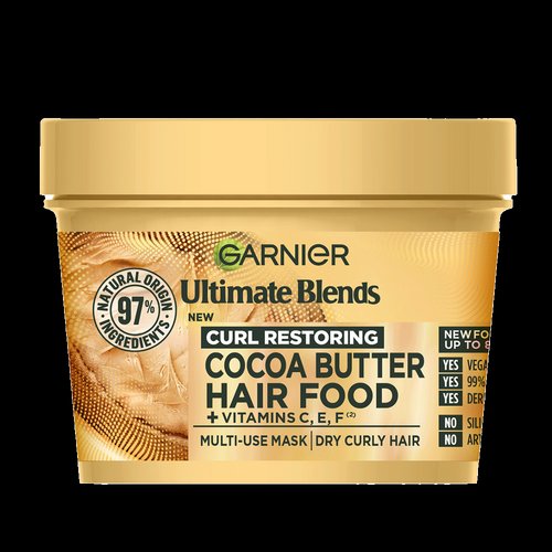 Discover NEW supercharged Garnier Cocoa Butter Hair Food Multi-Use Mask for dry curly hair, now boosted with Vitamins C, E & F(1) for your healthiest hair ever. Vitamin C is known for intense shine, Vitamin E makes hair feel moisturised and Vitamin F makes hair look stronger. Blended in our best-rated formula with nourishing Shea Butter and natural oils.